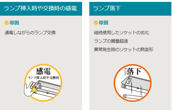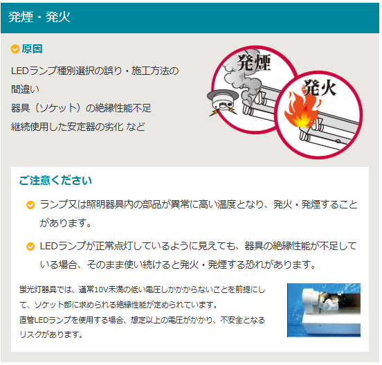 直管LEDランプと既設の照明器具の組み合わせが不適切な場合重大事故が発生しています。