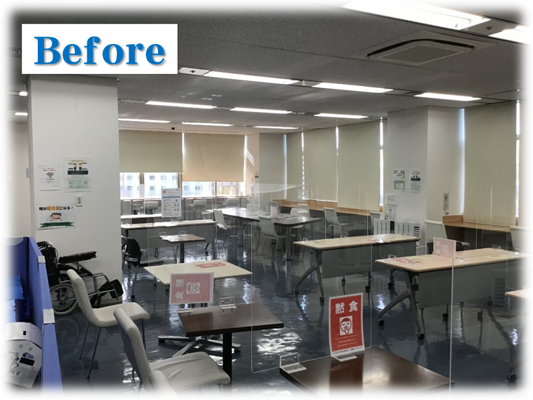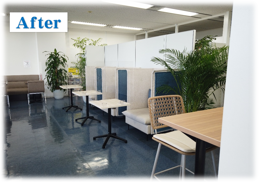 リフォームの要望は、席数を増やしつつ緑を取り入れた、リラックスできる休憩室」でした!新型コロナの感染拡大を避けるためにも休憩室を広げたい、従業員数も増えたので、その為に全体的な見直しをしたいとの依頼でした