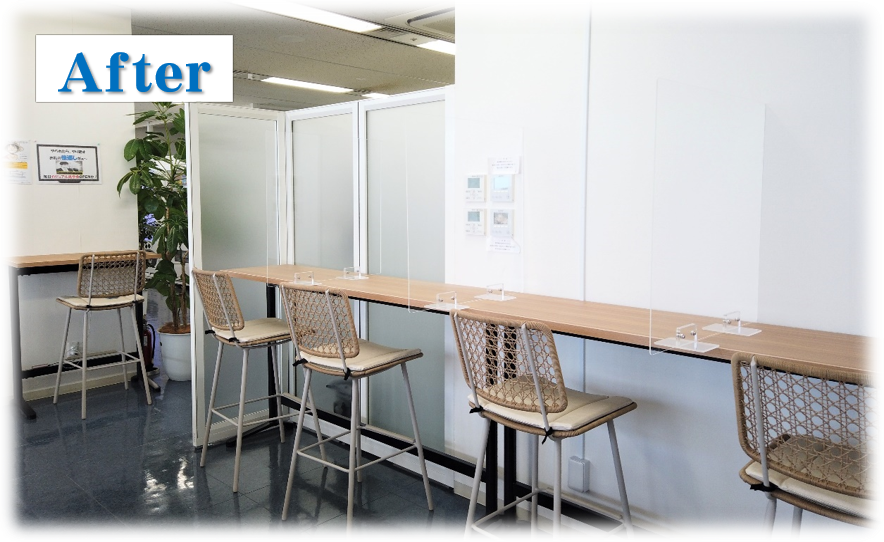 今までは冷蔵庫を置いていた出入り口のそばは、一人でも短時間の利用がしやすいハイカウンター席になっていました!