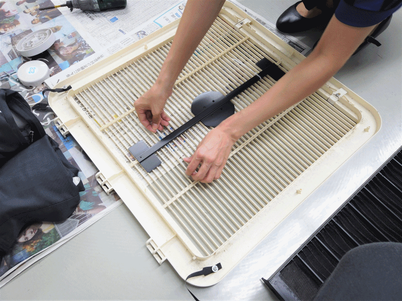 お次はエアコンのカバーを外して、ファンを取り付ける為の部品をカバーに取り付けていきます!