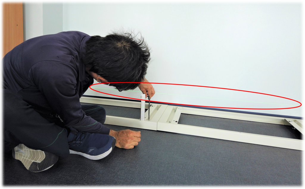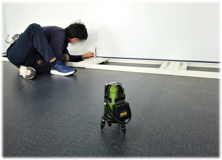 ここでは、保管庫の土台が水平になるように三角スケール(定規)も使って調整していますね!土台が平行でないと、扉の開閉がしづらかったり、きちんと閉まらなかったりと後々問題点が出てきます😥最初でしっかりと測っておく事が大事なんです!