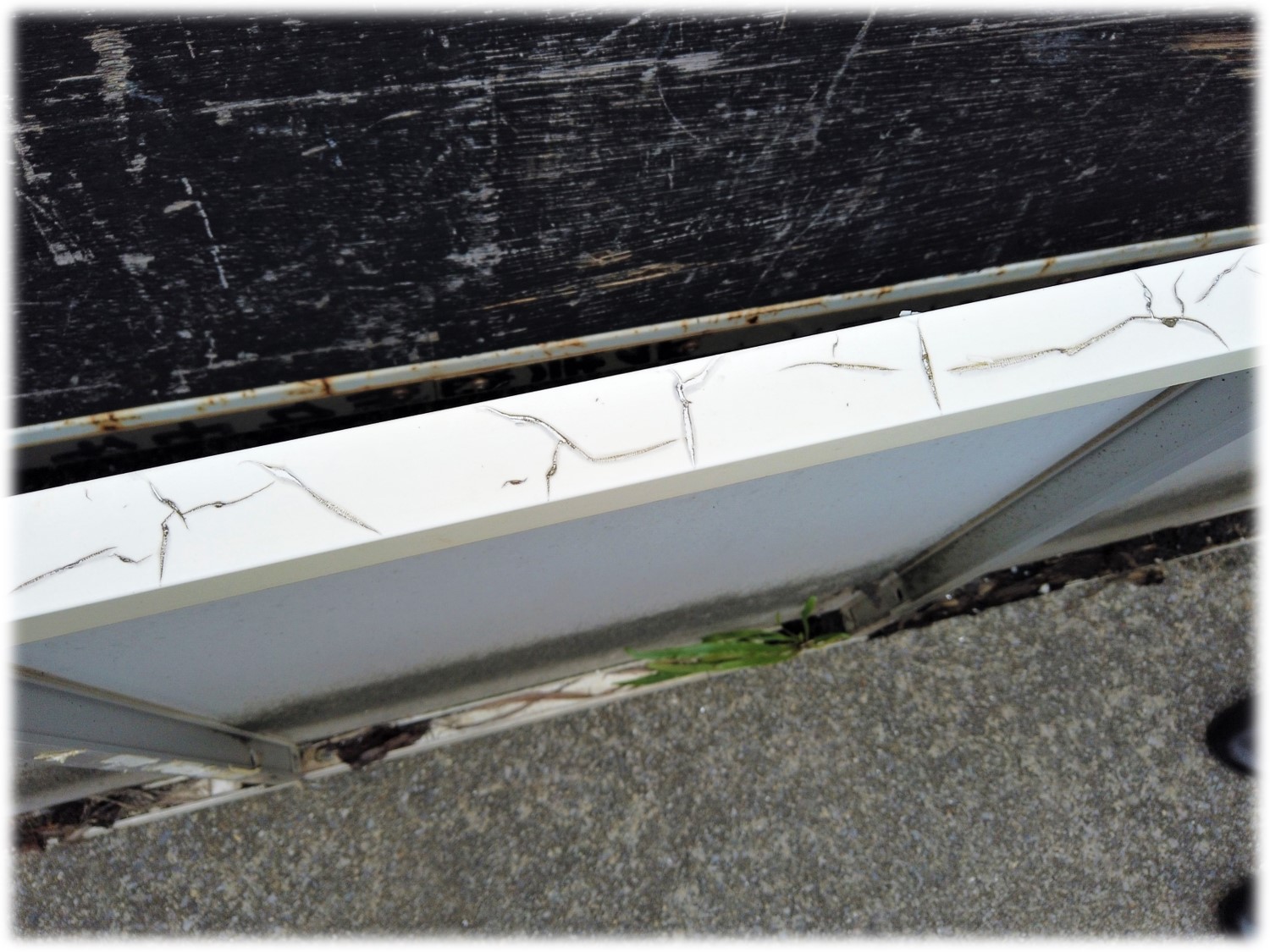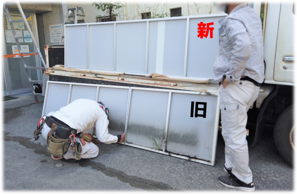 交換前の看板は、劣化によるひび割れ(クラック)から看板をコーティングしていたフィルムとの間に雨が入り込んでいました😰
