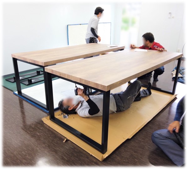 テーブルも天板の取り付けに取り掛かっています!落ち着いた木目の天板が、ドッシリとしたロの字型の脚にあっていますね😉
