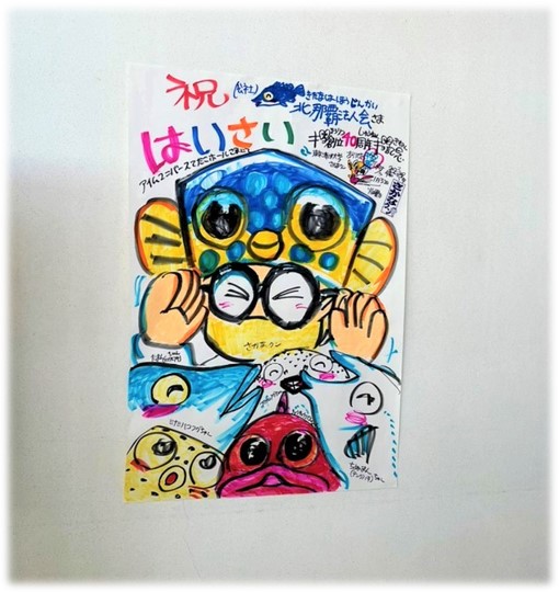 大盛況で講演会は終わりホールから出ると、なんとさかなクンが描いた絵が貼られていました!!ニッコリ笑顔のさかなクンとお魚さんで、こっちも笑顔になりそうな素敵なイラストです💓この講演の為に、いったい何枚のイラストを描いたのでしょうか…!絵を趣味としている者として尊敬します🥺🥺