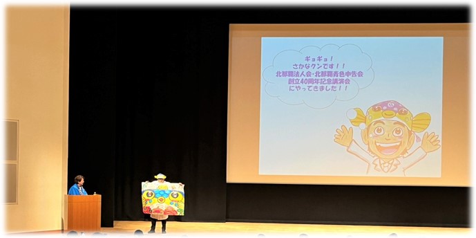 講演が始まると、ギョギョ!っとさかなクンが舞台袖から飛び出して登場しました🐡💨格好はもちろん、いつもの白衣にハコフグ帽子と黒ぶちメガネ👓