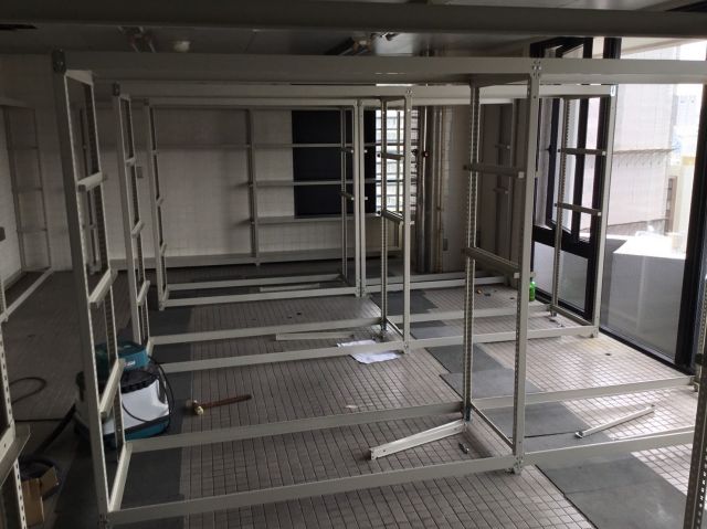 中軽量棚は、完全に出来上がった棚を設置するのではなく、オフィスの形状や高さに応じてオーダーメイドで作ります。