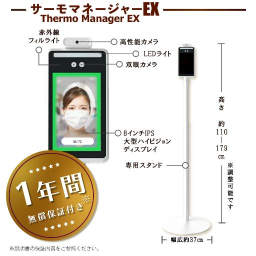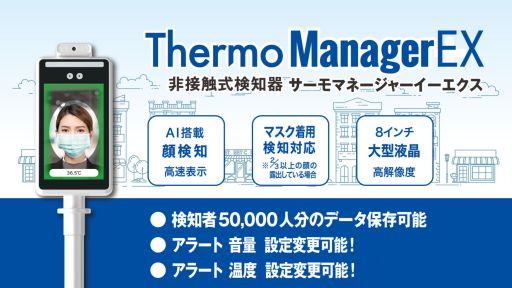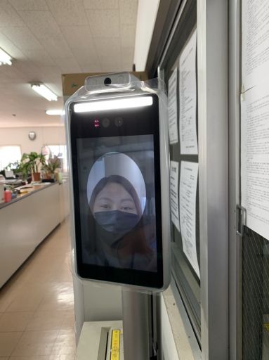 近づくとセンサーがキャッチし、自動で顔マスクの有無の判別と体温を測定します。