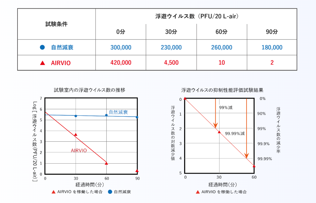 浮遊ウイルスの除去性能評価試験においてAIRVIOを稼働後、27分で99%、54分で99.99% ウイルスの減少を確認しました。