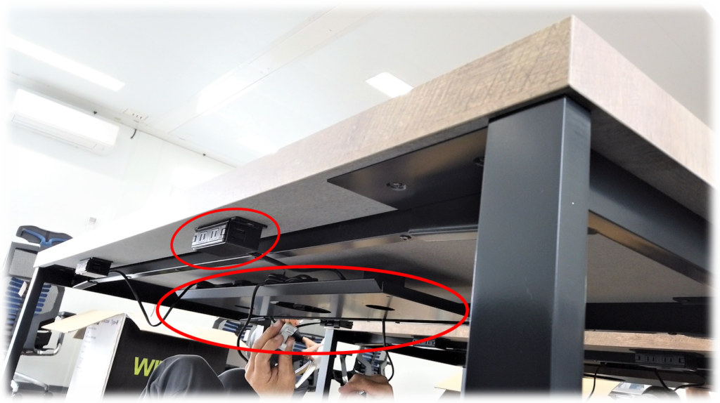 配線受け金具には、コンセントユニットの取り付けが可能で、天板裏に大型ダクトが設置されているのでコードも邪魔なくすっきり収納出来ます。