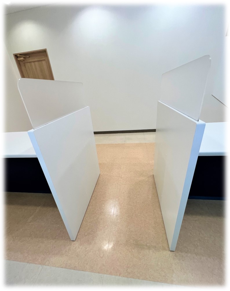 目線の高さにあわせたスクリーンパネルが設置可能。カウンターごとに足元から仕切れるので、隣のブースからの気になる視線を遮ります。